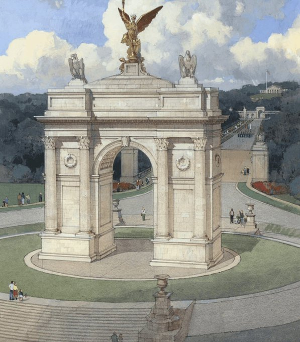 予想図では、凱旋門に「神の下にある一つの国」という金色の銘文が刻まれ、上部には翼を持つ女神像が据えられる。ワシントン近郊のアーリントン国立墓地近くに建設される予定だ。