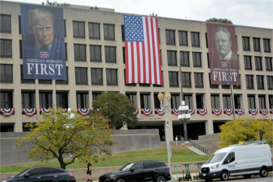 昨年には労働省や農務省にも同様の垂れ幕が登場した。国立公園の一般向け年間パスは、従来の野生動物や自然風景の写真に代わり、今年は初代大統領ジョージ・ワシントンとトランプ氏の肖像が採用された。