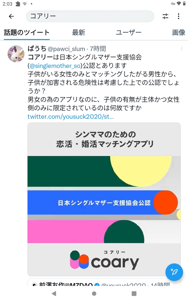 ZOZO創業者でスタートトゥデイ代表取締役の前澤友作氏(47)が監修した、シングルマザー限定の婚活・恋活マッチングアプリ「coary(コアリー)」(マッチングトゥデイ)が27日、リリースされた。日本国内における恋活・婚活マッチングアプリとしては、初だという。
