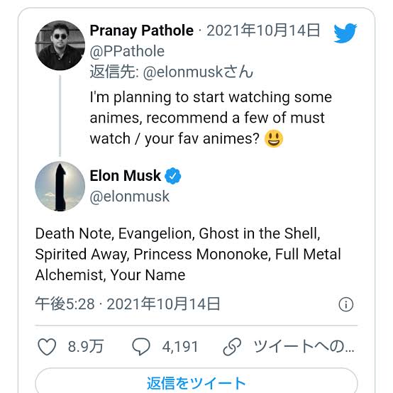 イーロン・マスクがデスノートとかエヴァンゲリオン見てるの想像つかない