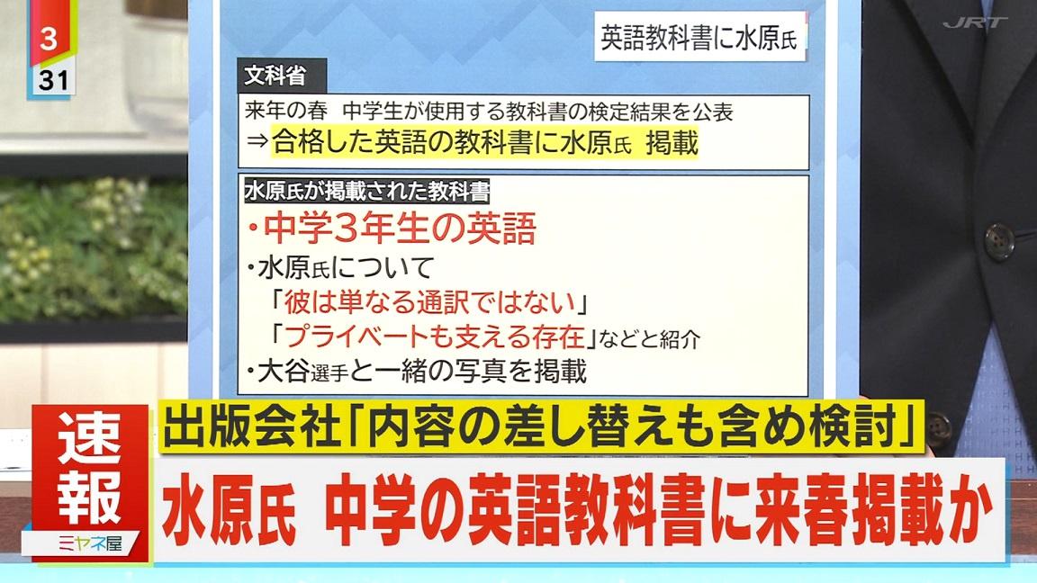 来年春から使われる中学校の教科書の検定結果が22日公表され、合格図書のなかに、大谷翔平選手の元通訳で賭博問題でドジャースを解雇された水原一平氏を取り上げた英語の教科書が含まれている事がわかった。