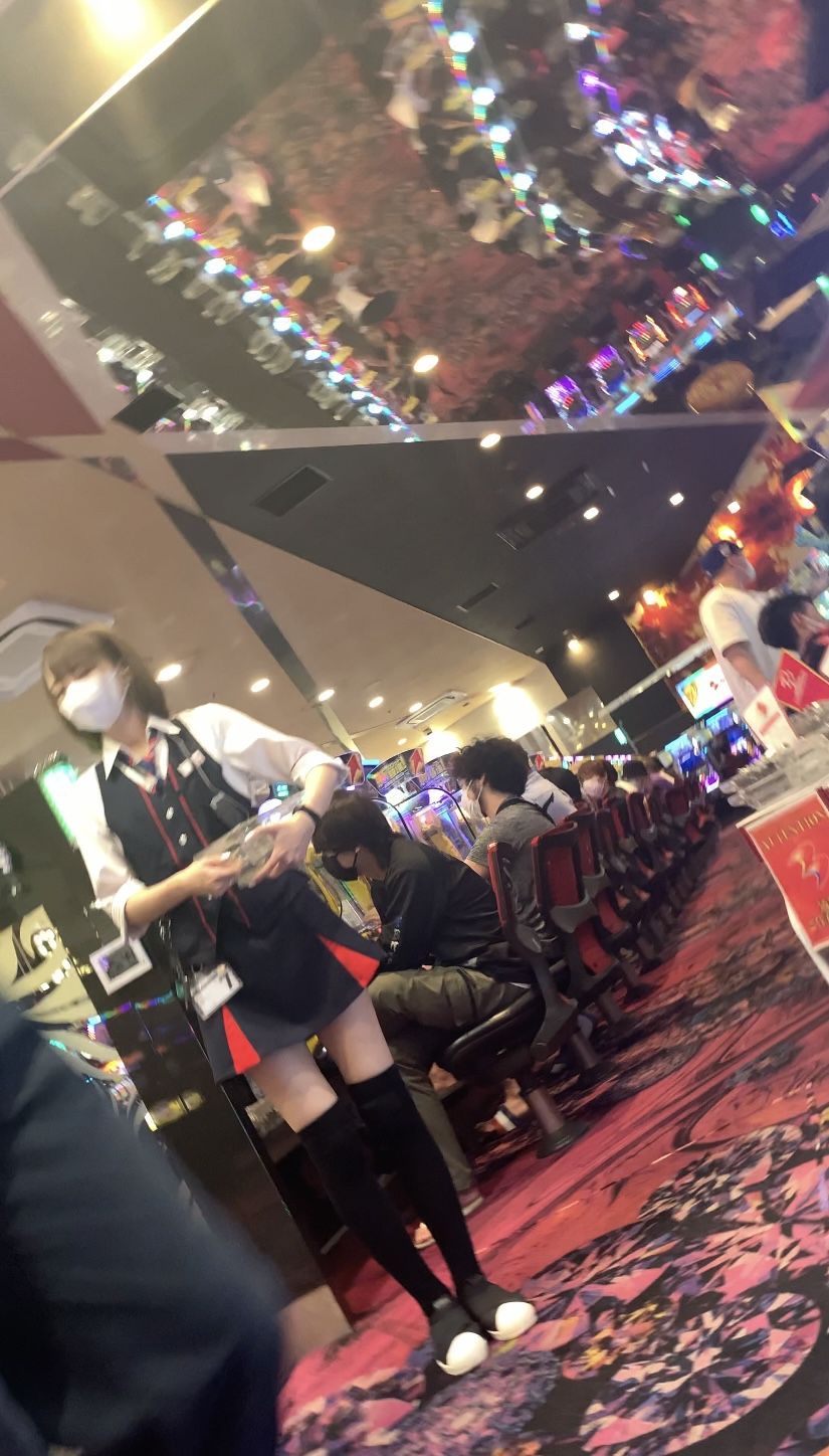 ようやく入店すると、店内は非常に広く圧巻である。パチンコは白を基調としている天井や壁にもこだわり、全体として明るくシャープなイメージの空間だと感じられた。またパチスロ側は黒・赤を基調とし曲線を多く入れた配置になっている。照明も落としてあり、クラブに立ち入ったかのようだ。