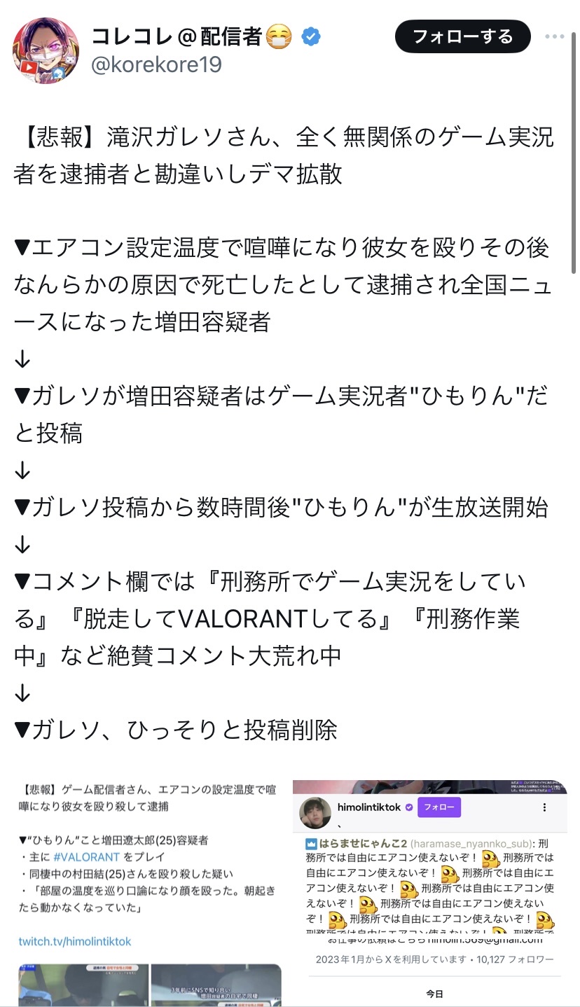 【悲報】滝沢ガレソさん、全く無関係のゲーム実況者を逮捕者と勘違いしデマ拡散