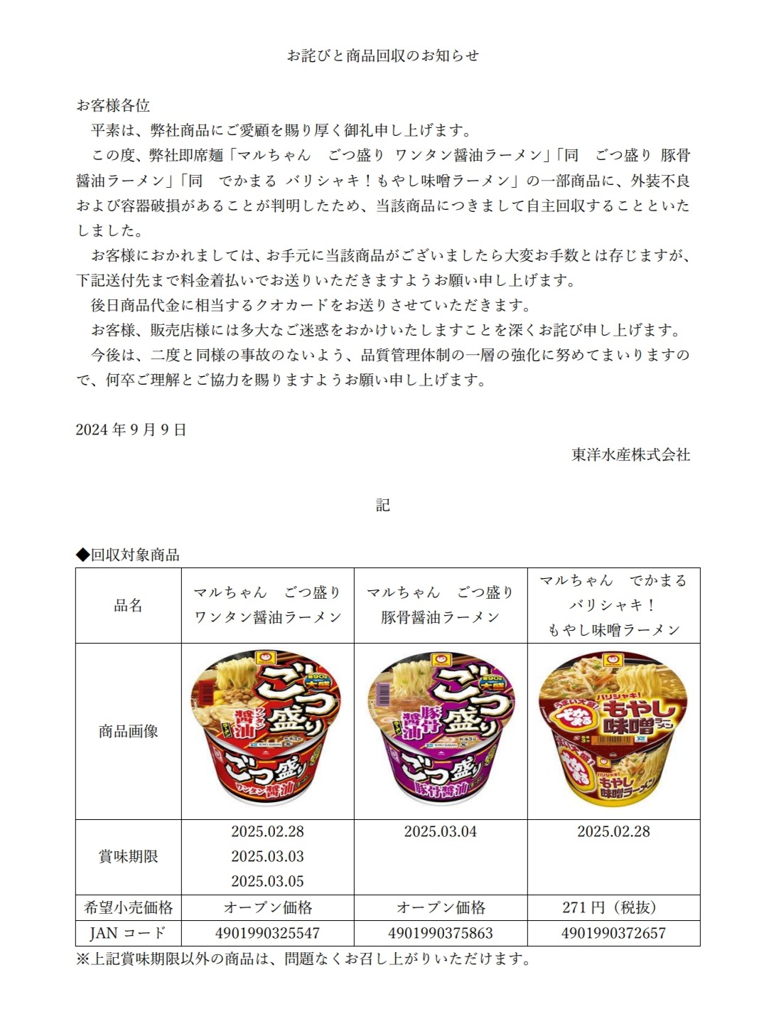 この度、弊社即席麺「マルちゃん ごつ盛り ワンタン醤油ラーメン」「同 ごつ盛り 豚骨醤油ラーメン」「同 でかまる バリシャキ!もやし味噌ラーメン」の一部商品に、外装不良および容器破損があることが判明したため、当該商品につきまして自主回収することといたしました。