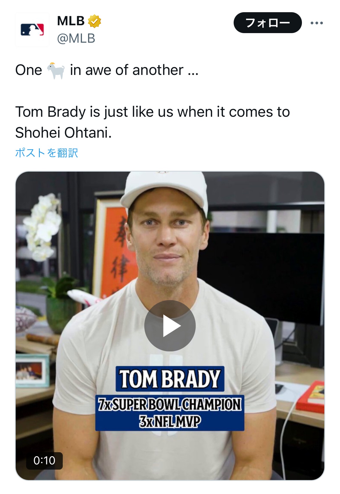 NFLスーパースターのトム・ブレイディから動画で祝福メッセージをもらう大谷