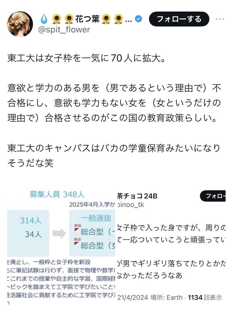 女に生まれたというだけで東工大や京大理学部の学歴が手に入る模様